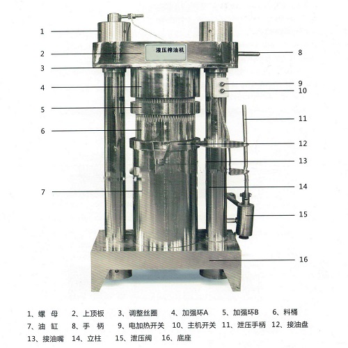 結(jié)合下圖,下面我們對應(yīng)液壓榨油機(jī)的結(jié)構(gòu)詳細(xì)介紹一下各部件的功能與作用